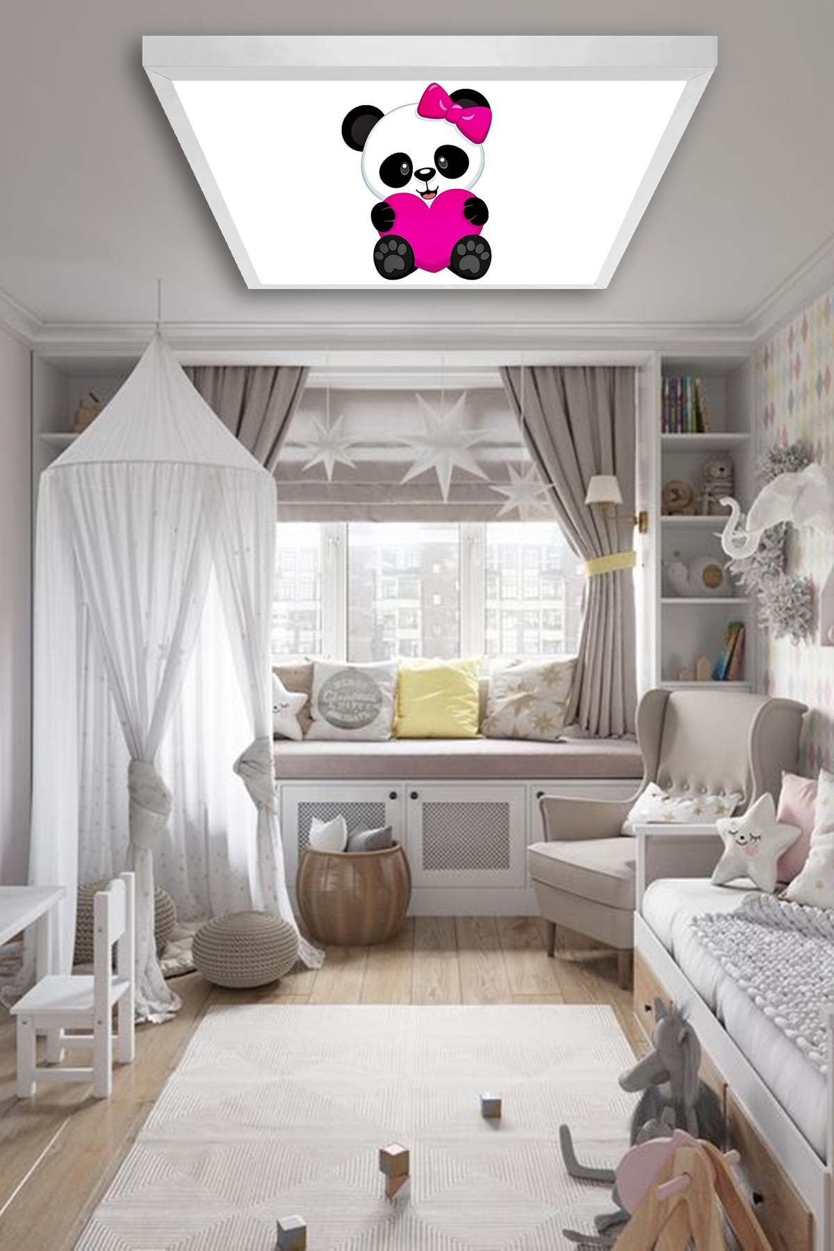 Yavru Panda Çocuk odası avize modelleri, 60×60 baskılı kare avize, 54wat led tavana model